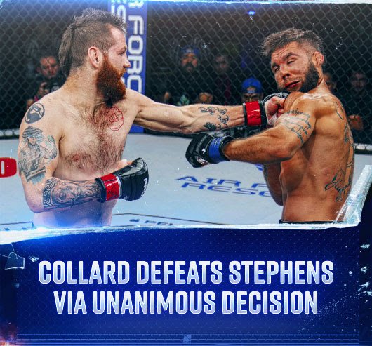 In the main event, Collard bested PFL newcomer Jeremy “Lil” Heathen” Stephens by unanimous decision. Collard and Stephens put on a slugfest throughout the three-round contest, with the former coming out victorious by unanimous decision, 30-27 across the board.
